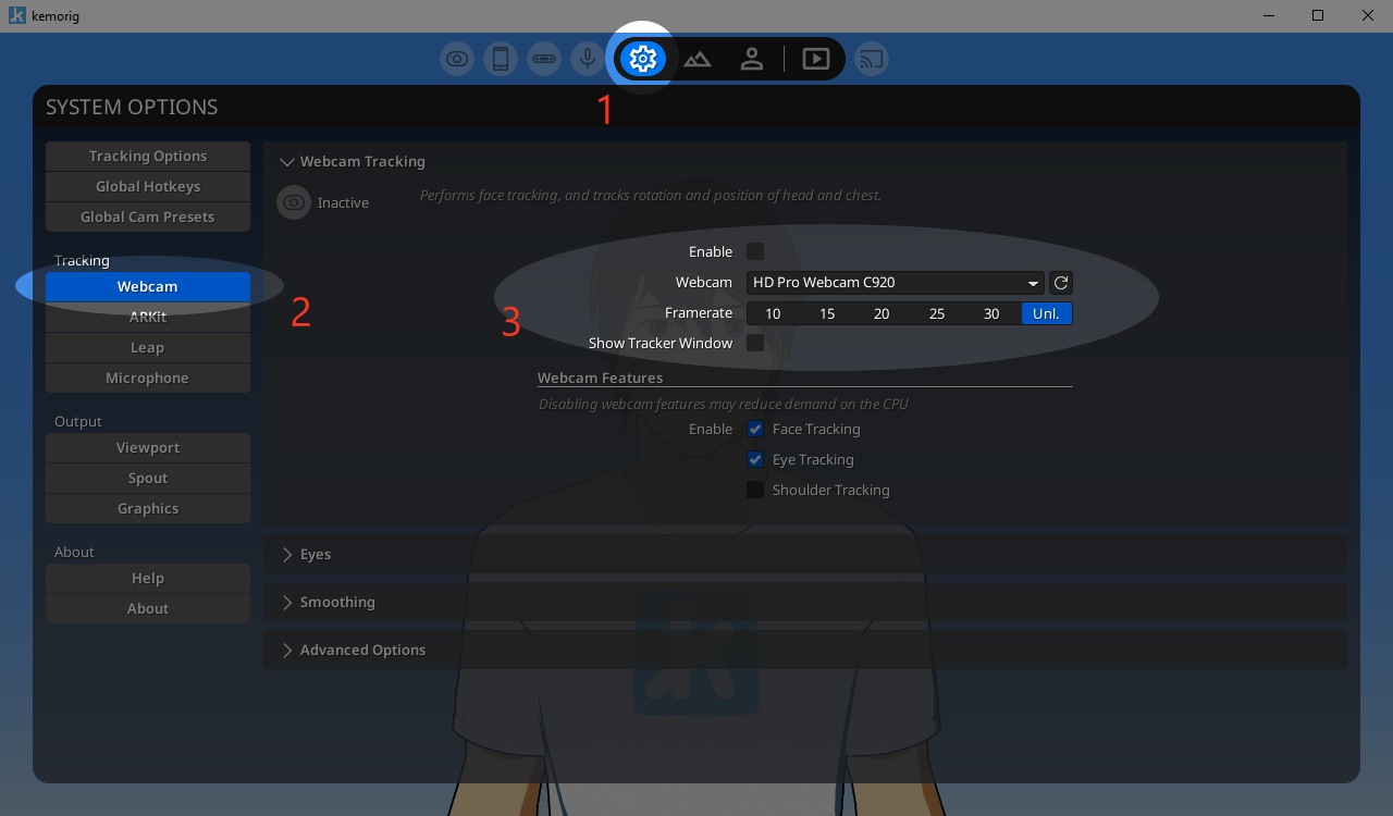 Kemorig supports Webcam Tracking, which can track: