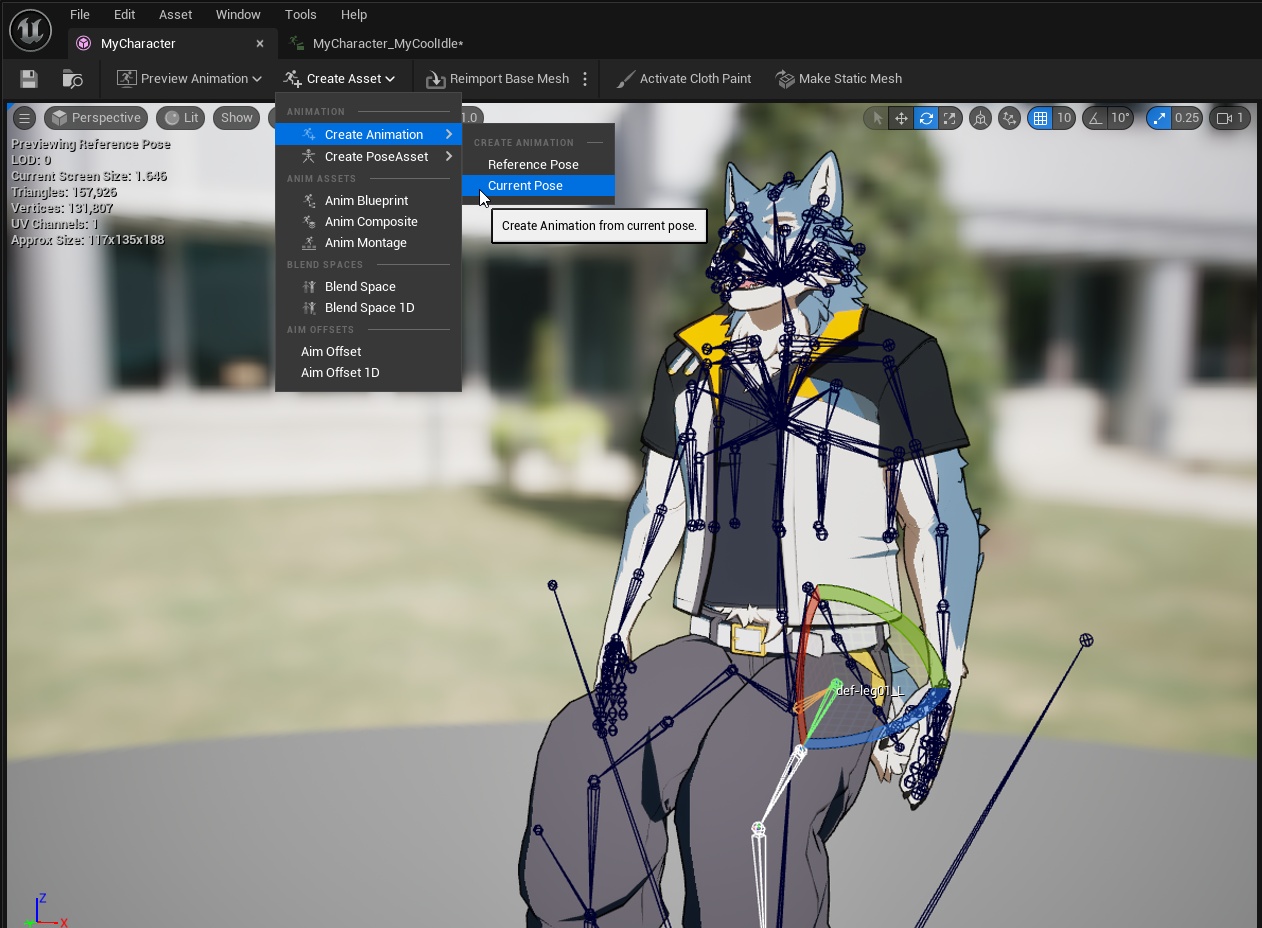 To do so, above the viewport click Create Asset > Create Animation > Current Pose