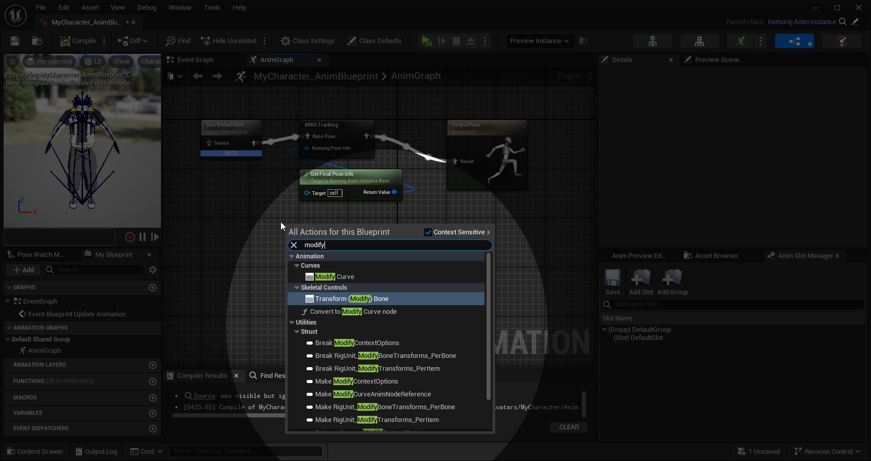 Once you compile the nodes at least once, you should see the model pose update in real time in the blueprint’s viewport.