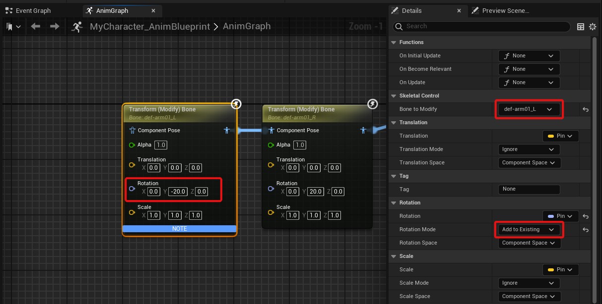 Add “Transform (Modify) Bone” Nodes