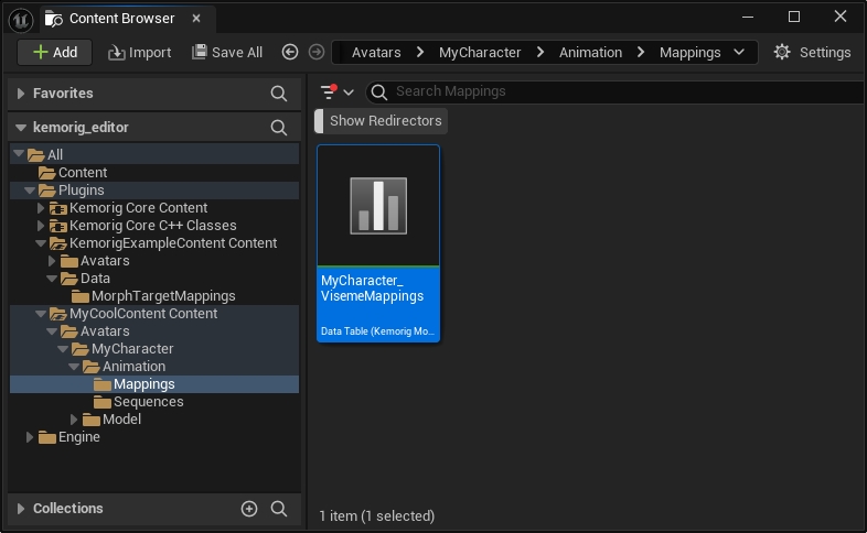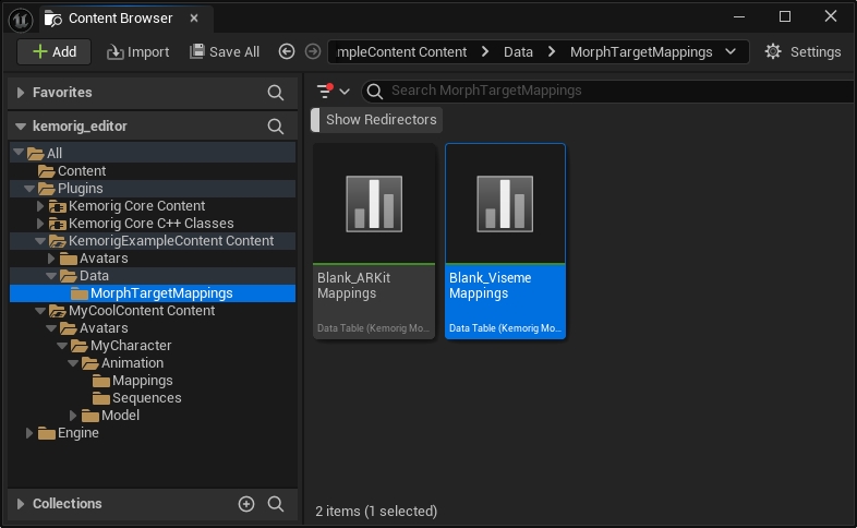 In the content browser, navigate to the folder KemorigExampleContent Content/Data/MorphTargetMappings/ and find Blank_VisemeMappings. Copy/Paste a copy of this into our folder and rename it.