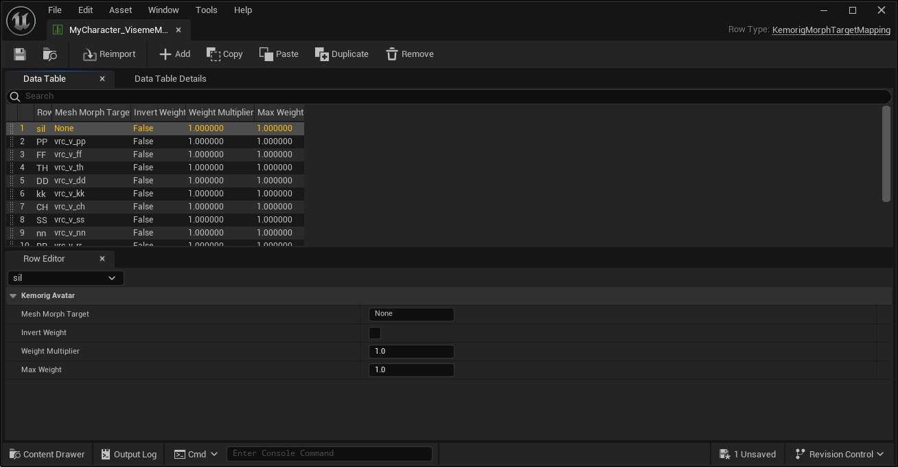 Now let’s create a DataTable to map our model’s morph targets with viseme names.