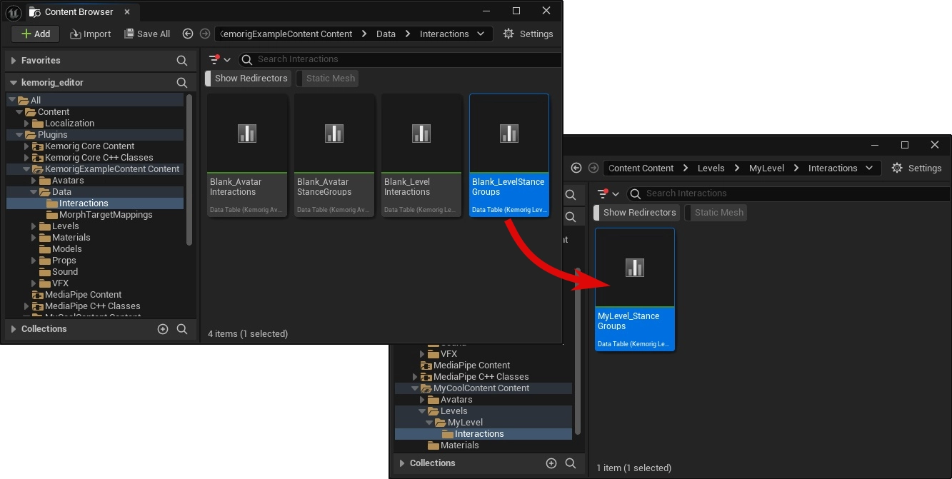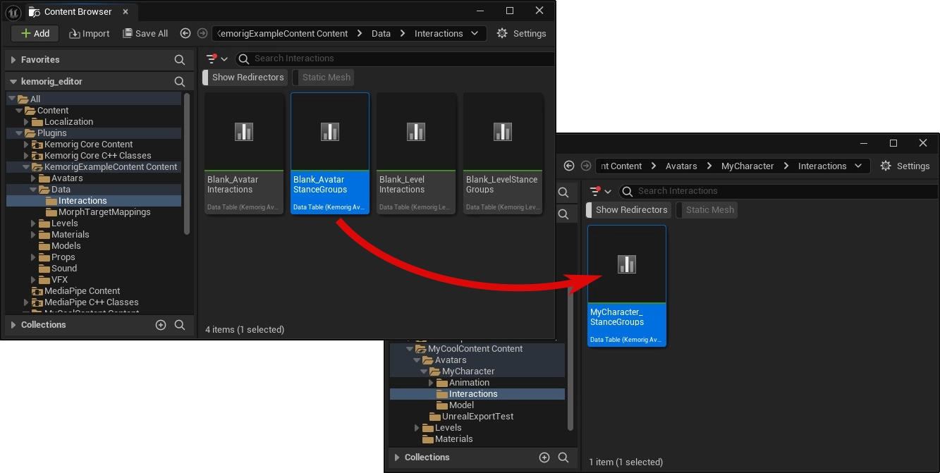 - In the content browser, navigate to the folder KemorigExampleContent Content/Data/Interactions/