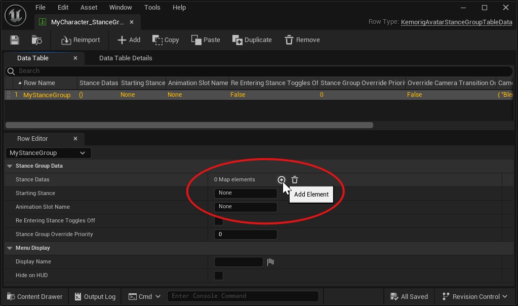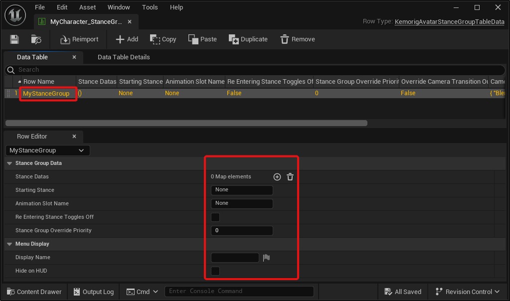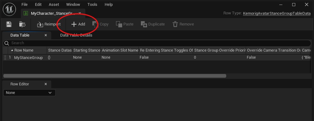 This is all we need to do to enable Stance Groups. Now, any rows we add in the DataTable will create a new Stance Group we can use in kemorig.