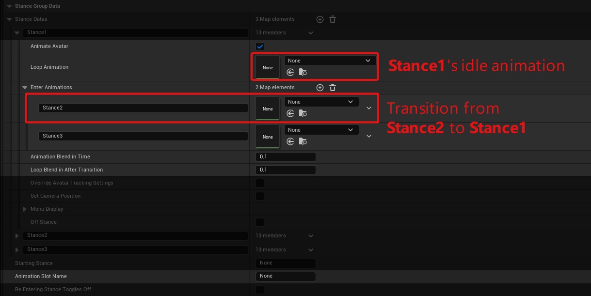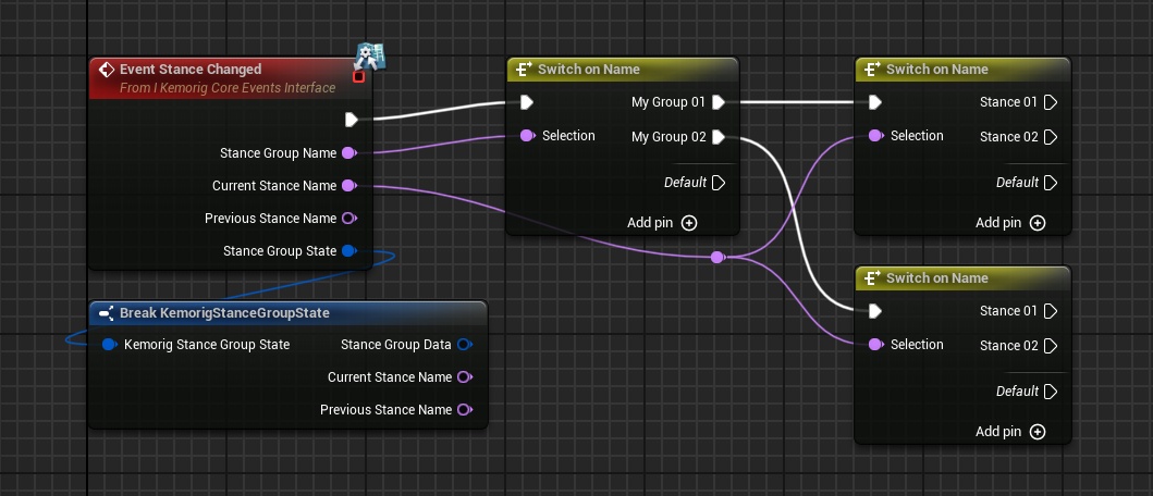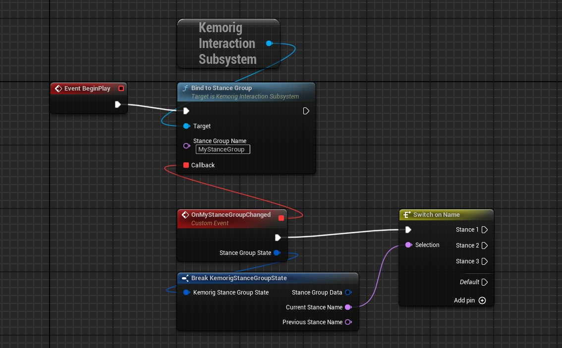 Just like Interactions, Stance Groups allow you to run arbitrary blueprint logic using events in any blueprint (often your avatar blueprint).
