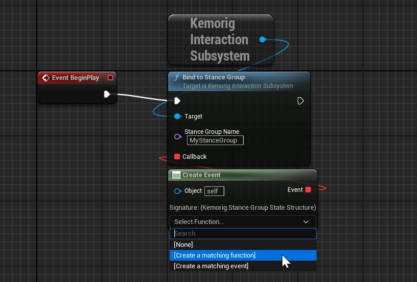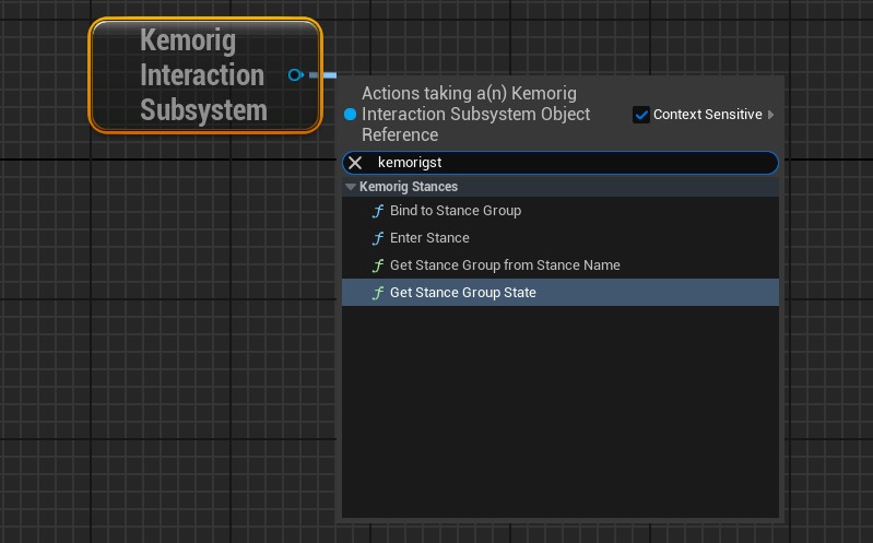 - Drag the pin out of a Get Kemorig Interaction Subsystem node and search for “Kemorig Stances” functions.