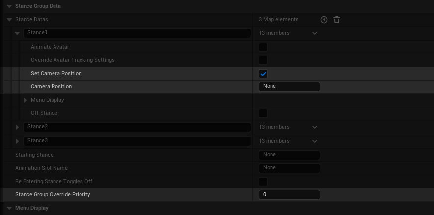 The Stance Group Override Priority setting determines how this Camera Position will stack with others. See the Camera Positions documentation for more info.