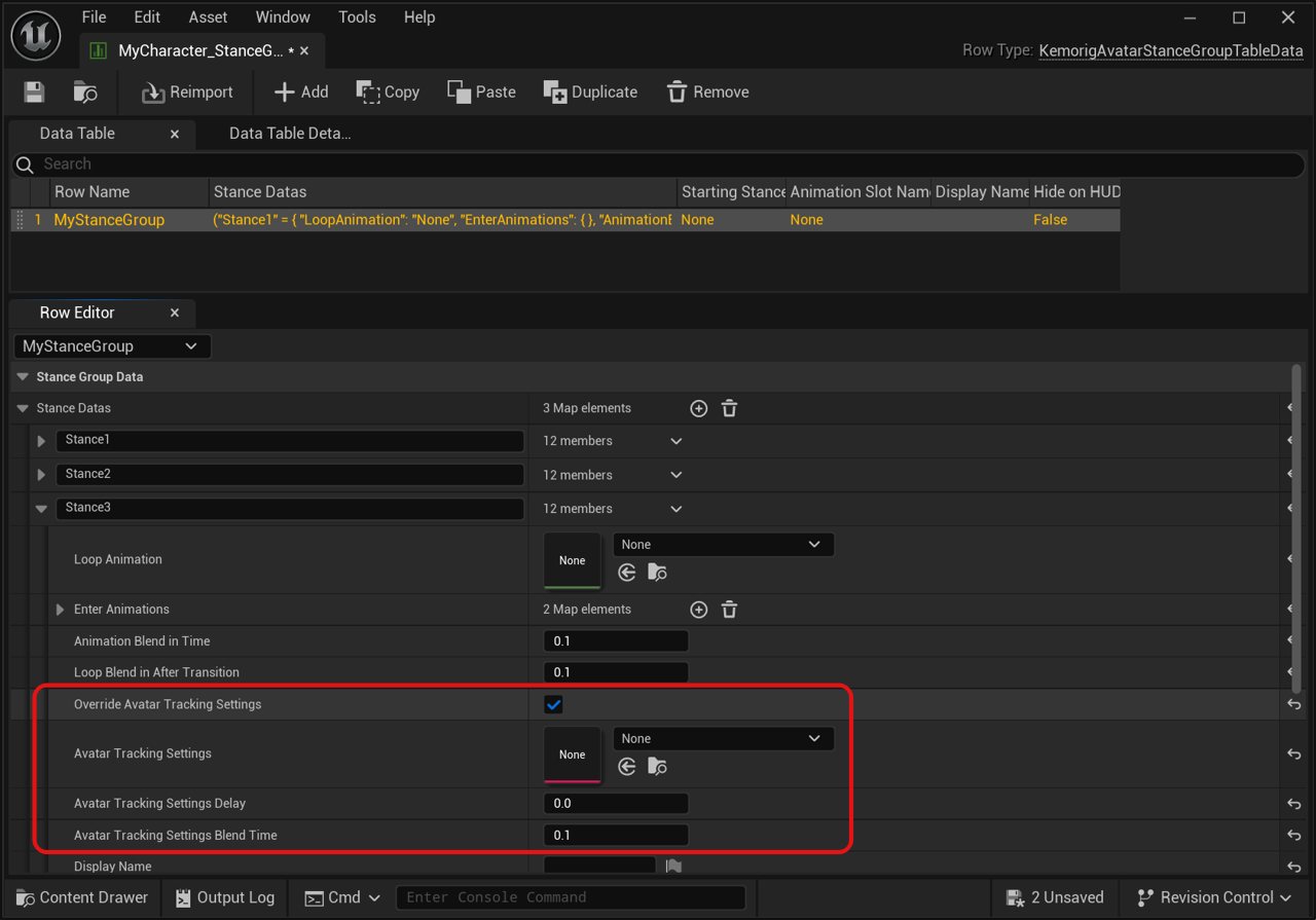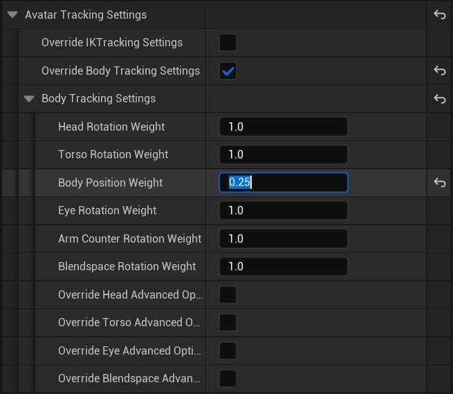 Inside the data for a given stance, find the checkbox for “Override Avatar Tracking Settings”. Enable it, and additional properties will appear. You can plug-in a Tracking Settings Data Asset and adjust settings for how it blends-in.