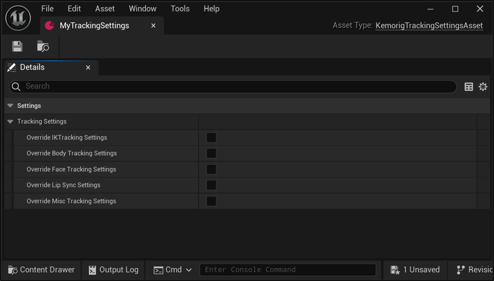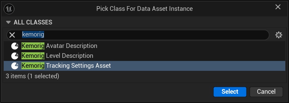 - In the window that pops up, search for "Kemorig Tracking Settings Asset" and select that type.
