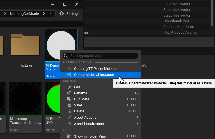 When using Kemorig CelShade Materials, righ click one and select “Create Material Instance”. This will create a child of that Material, and you can then tweak parameters and pass in your own texture maps.