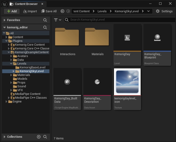Example content is located in the Content Browser in Plugins/KemorigExampleContent Content/.