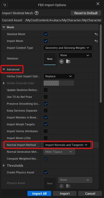 To make sure you import the model’s normals (as opposed to Unreal generating new ones on import), make sure Normal Import Method is set to “Import Normals and Tangents”.