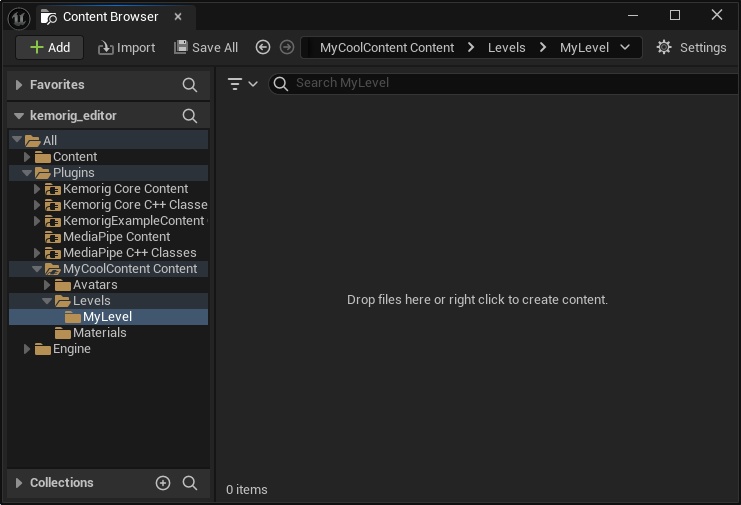 First, let’s be organized and create new folders in our plugin content directory where we’ll store our level’s assets.